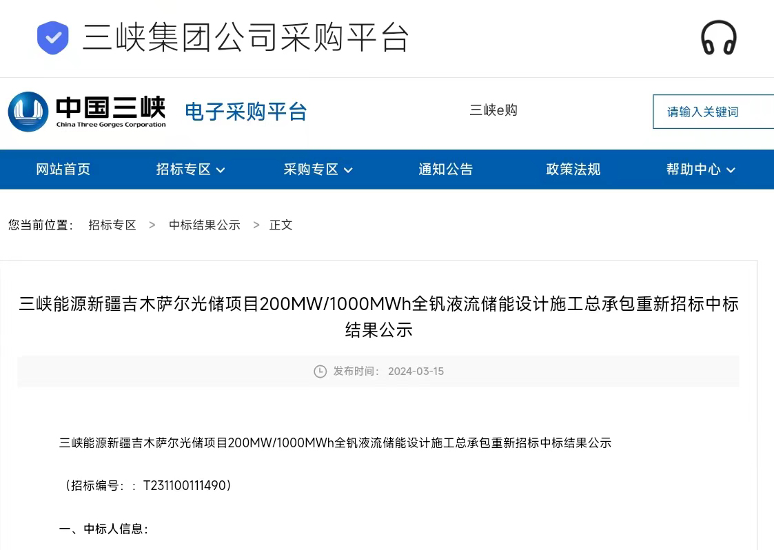 公司新闻 | 大连融科中标三峡能源1GWh全钒液流电池储能项目
